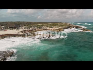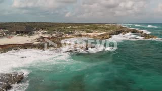 Forwards fly above tourists admiring interesting coastal rocks, sea waves crashing to coast