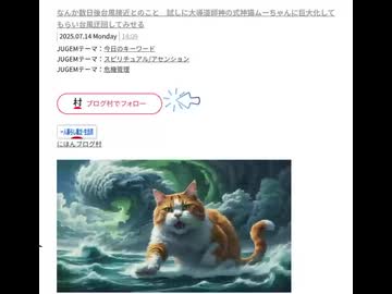 なんか数日後台風接近とのこと 試しに大導道師神の式神猫ムーちゃんに 巨大化してもらい台風迂回してみせる