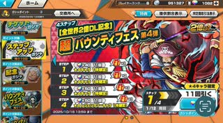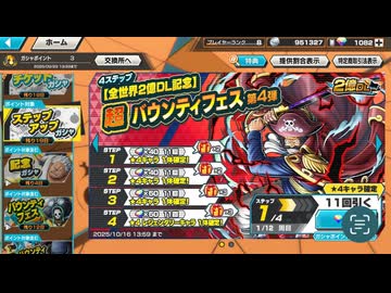 ONE PIECE(ワンピース)バウンティラッシュで、全世界2億DL記念 超レジェンダリー チケット 第4弾ガシャ「大海賊 ゴール・D・ロジャー」を狙って、虹のダイヤを980個を使ってガチャを引く動画