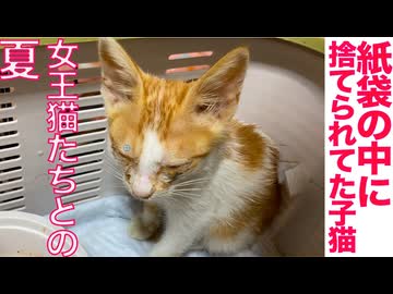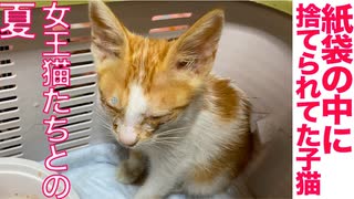 紙袋に入れて捨てられてた子猫、女王猫の家に来る