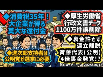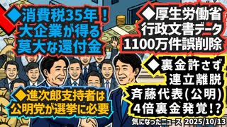 ◆消費税35年!大企業が得る莫大な還付金◆進次郎支持者は公明党が必要◆裏金脱税!連立解消公明党斉藤代表が4倍の不正◆厚生労働省による行政文書データ1100万件の誤削除