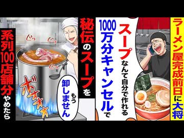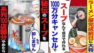 【スカッと】ラーメン屋完成前日に「スープなんて自分で作れる!」→100万分キャンセルした結果…系列100店舗が大混乱!