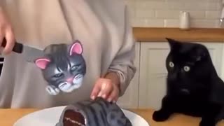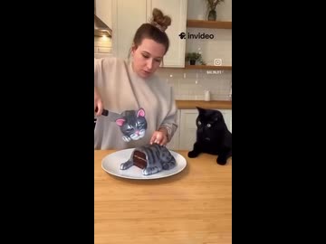 ホモと見るカットされたネコ型ケーキを見てたまげるネコ