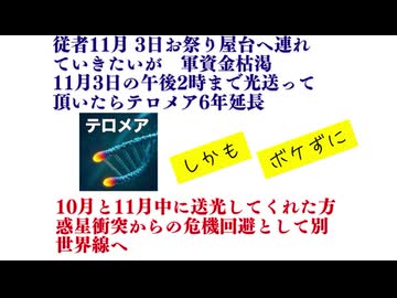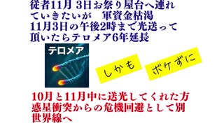 従者11月 3日お祭り屋台へ連れていきたいが 軍資金枯渇 11月3日の午後2時まで光送って頂いたらテロメア6年延長 更に10月と11月中に送光してくれた方 惑星衝突からの危機回避として別世界線へ