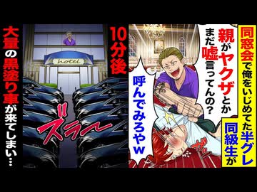 【スカッと】同窓会で半グレ同級生が「親がヤクザ?まだ嘘ついてんの?呼んでみろよw」→10分後、黒塗りが大量に到着し…