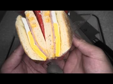 300円24銭のセブンイレブンのもちっと食感のソーセージエッグマフィンを切りました。 #セブンイレブン #ソーセージエッグマフィン
