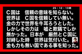 25・12・13朝 何故日本は 80年間も搾取され続けたのか?敗戦国だからですか?違うだろう?分け前貰っていたからだろう。政治家もC・K国の仲間だった。日本国政治家が 日本人を苦しめて来た。