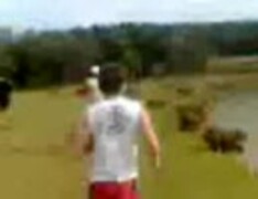 若者に追い回され、一斉に池に飛び込むカピバラさん