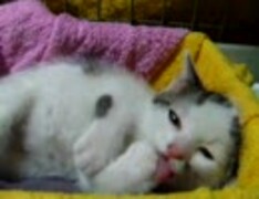 仔猫メタス、自分の手をなめる