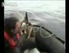 シャチに食べられそうなペンギン、ボートに乗り込んでセーフ!