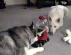 (犬)餌をもくもくと食べ続けるシベ犬と見守る白わんこ