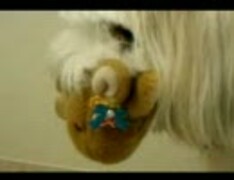 ひもを引っ張って自分でオモチャ遊びをする犬ポニー