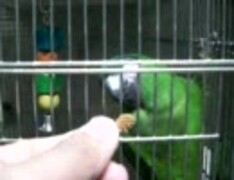 粟穂を欲しがるコミドリコンゴウインコ
