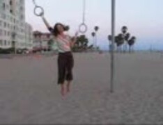 吊り輪を移動しながらフラフープをする超人芸を披露する女性のムービー