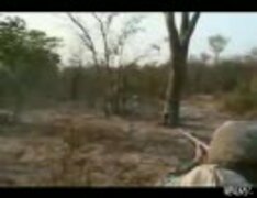 銃を構えたハンター達に猛然と突進していくライオン