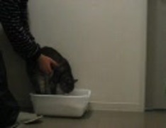 変な体勢でトイレを使うネコ