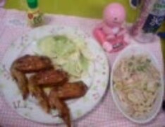 就活生の手羽先の唐揚げ+鮭のクリームパスタ