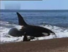 二頭のシャチがオタリア(アシカの仲間)を狩る。