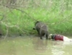 猟犬とイノシシが水中戦