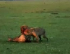 ハイエナが生きたままヌーを食らう