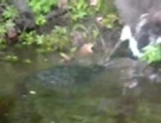 カミツキガメが鳥を水に引きずり込もうとしてる