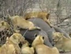 ライオンの群れがサイを食べてる