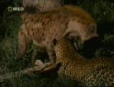 ヒョウとハイエナが獲物を取り合う
