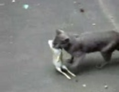 森の中から黒猫がウサギ咥えてきた