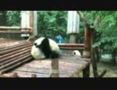 2015年2月22日中継のハイライト 星語(シンユゥ)、星願(シンユェン)と毛竹(マオジュー)が水場から出た後、大乱闘。手前で木に登っているのは成就(チェンジュウ)。仲間の戦いをこっそり見ている。