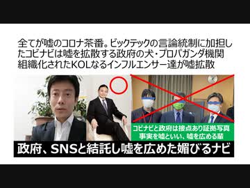 【ニコ動同時掲載】全てが嘘のコロナ茶番。ビックテックの言論統制に加担したコビナビは嘘を拡散する政府の犬・プロパガンダ機関組織化されたKOLなるインフルエンサー達が嘘拡散 政府、SNSと結託し嘘を広めた媚びるナビ