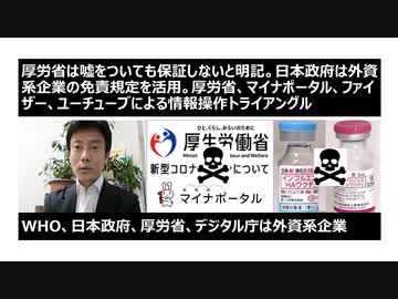 【ニコ動同時掲載】厚労省は嘘をついても保証しないと明記。日本政府は外資系企業の免責規定を活用。厚労省、マイナポータル、ファイザー、ユーチューブによる情報操作トライアングル WHO、日本政府、厚労省、デジタル庁は外資系企業