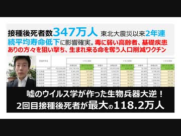 【ニコ動同時掲載】接種後死者数347万人 東北大震災以来2年連続平均寿命低下に影響確実。毒に弱い高齢者、基礎疾患ありの方々を狙い撃ち、生まれ来る命を奪う人口削減ワクチン