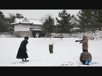 佐賀県内に寒波、平野部でも積雪 雪化粧した佐賀城鯱の門の前ではインドネシアからの留学生が雪遊び(2024年1月24日)