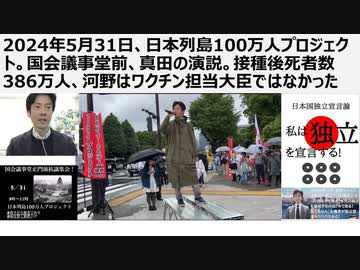 【日本独立】2024年5月31日、日本列島100万人プロジェクト。国会議事堂前、真田の演説。接種後死者数386万人、河野はワクチン担当大臣ではなかった コロナ元年は前年より人は死なず岸田は宴会三昧