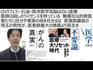 ロックフェラー石油・西洋医学洗脳は白い虚像 医師は殺しのライセンスを持っている 無責任な詐欺医者たちに自分や家族の命を任せるな 医者数最低の埼玉の男性が、医者数最大の徳島より長生き