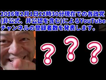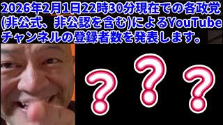 2026年2月1日(日)22時30分、現在での各政党【非公式、非公認を含む】によるYouTubeチャンネルの登録者数を発表します。 #衆院選 #解散 #期日前