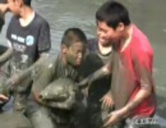 「堤干し」で中学生がコイつかみ取り体験
